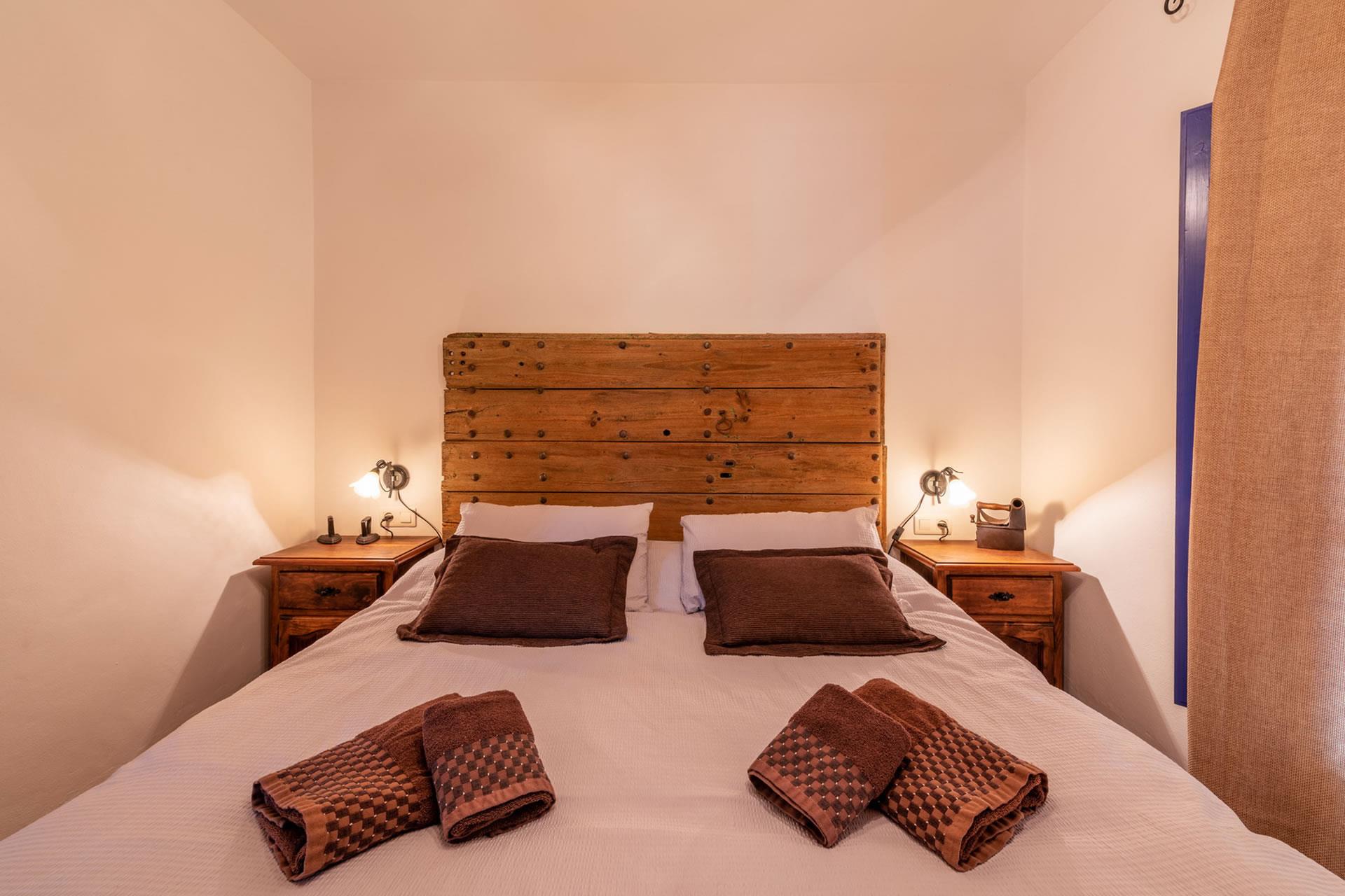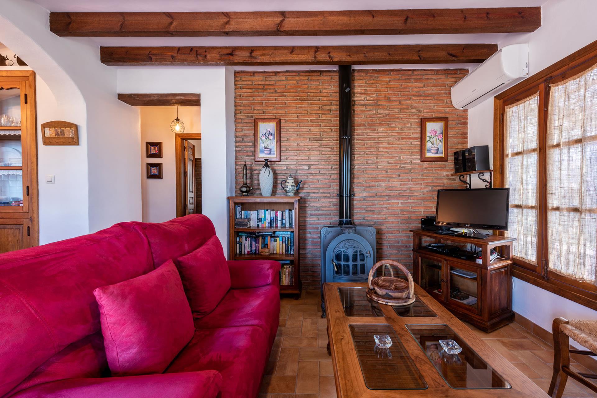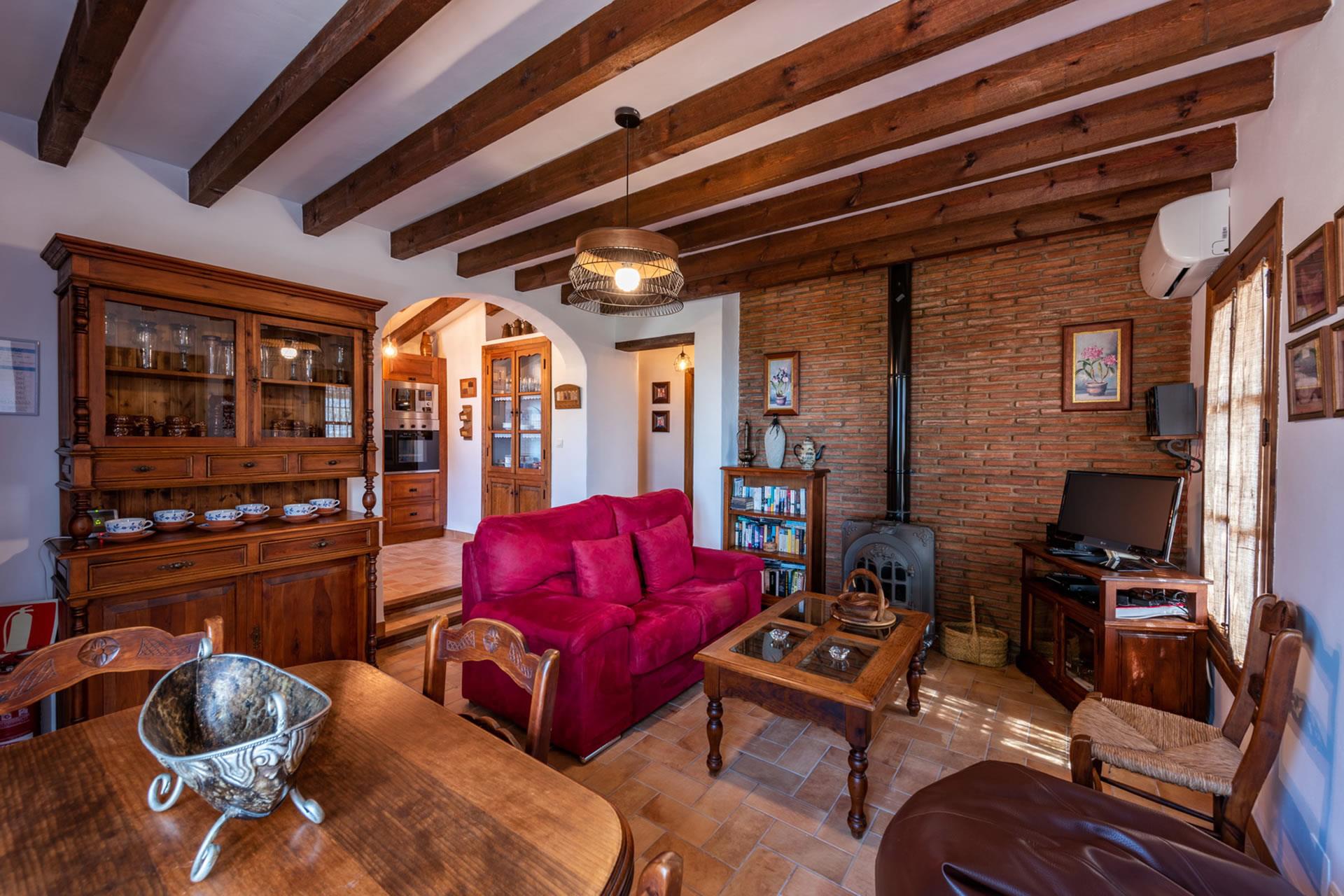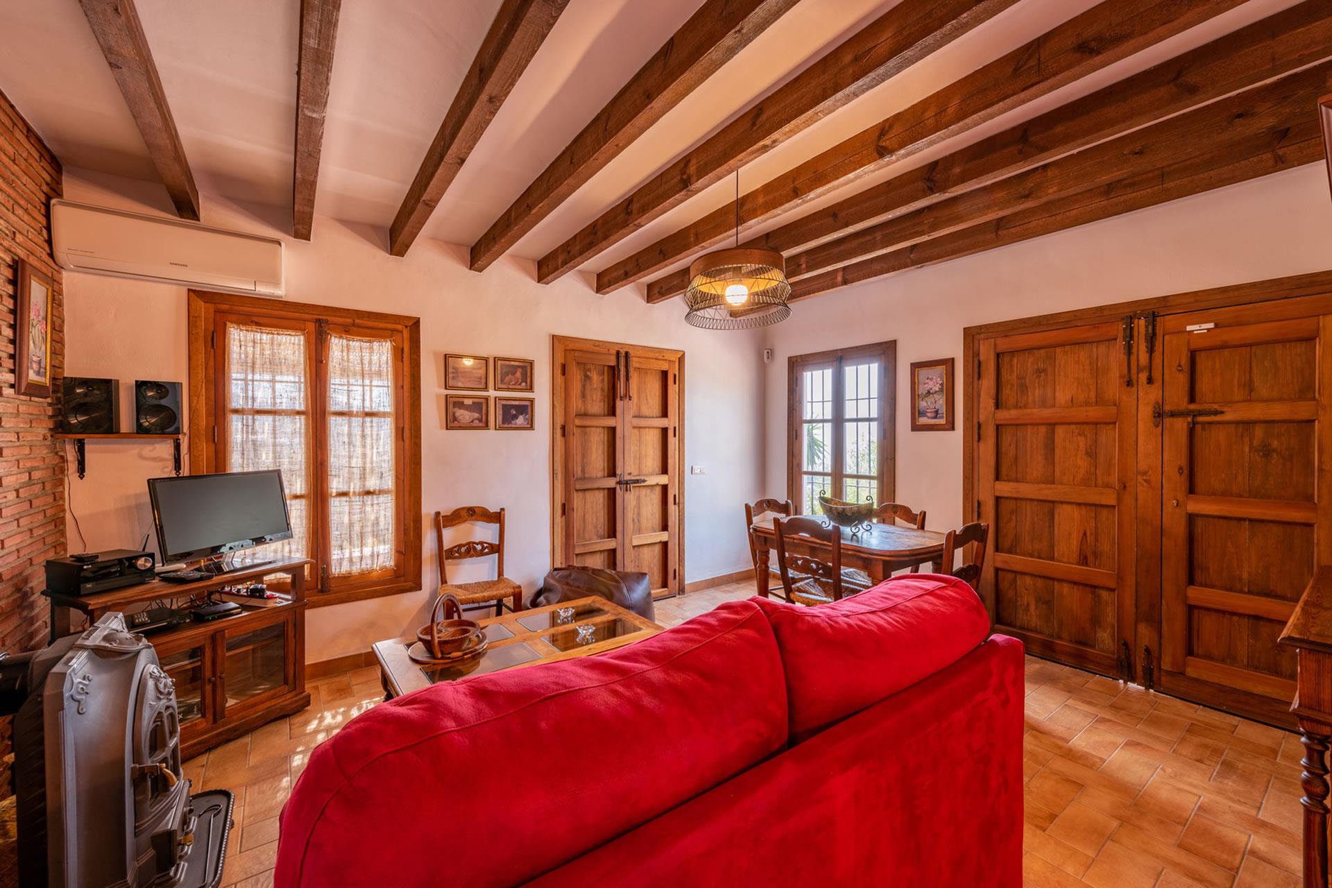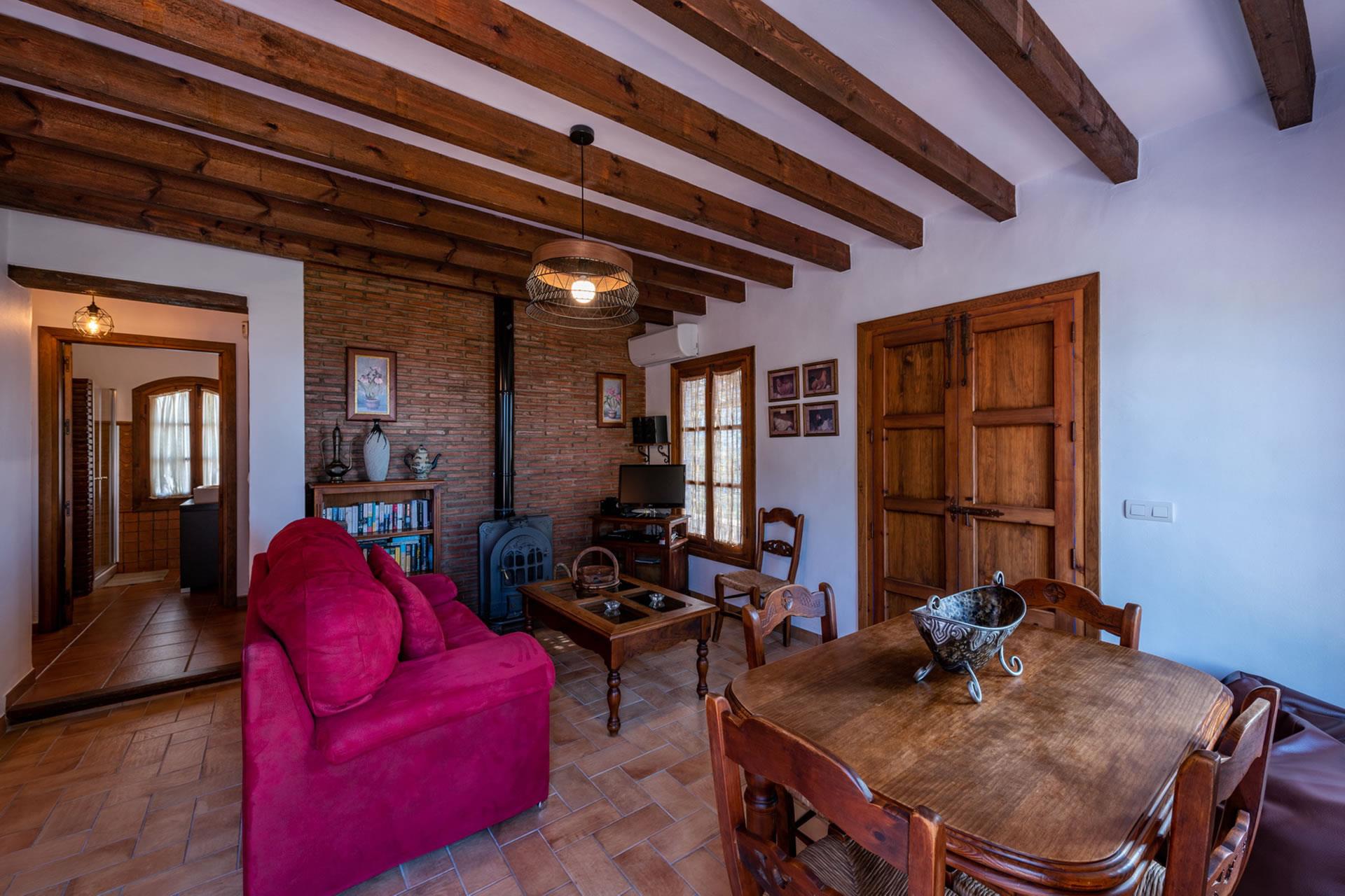 Toutes les pièces du gîte sont au rez-de-chaussée, aménagées avec goût et décorées dans un style rustique andalou. L'intérieur présente un espace décloisonné avec une marche qui monte à une grande cuisine; l'espace du salon comprend un téléviseur, un appareil de musique et un poêle à bois pour réchauffer les hivers. Le plafond est élevé, ouvrant l'espace et augmentant le confort de l'aération durant les jours d'été. Les fenêtres sont grandes et les portes-fenêtres avec moustiquaires ouvrent sur la véranda ombragée. La cuisine est bien équipée avec plaque de cuisson vitrocéramique à 4 feux, four, micro-ondes, lave-vaisselle, réfrigérateur / congélateur, vinothèque et cafetière. Un lave-linge est installé dans une pièce à part. Il y a 2 chambres (une à 1 lit 2 personnes, une à 2 lits 1 personne) et une salle de douche avec WC et lavabo.
