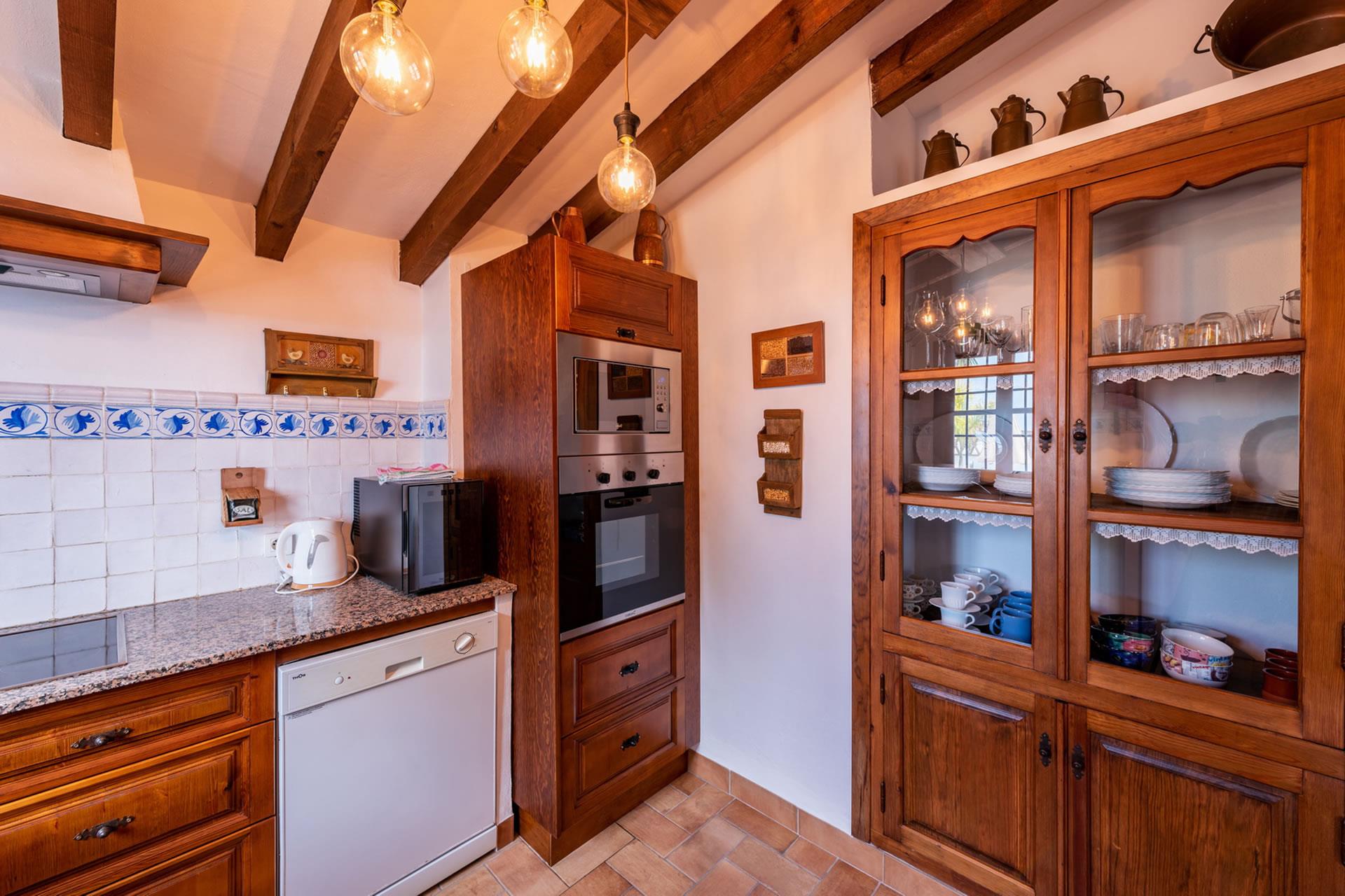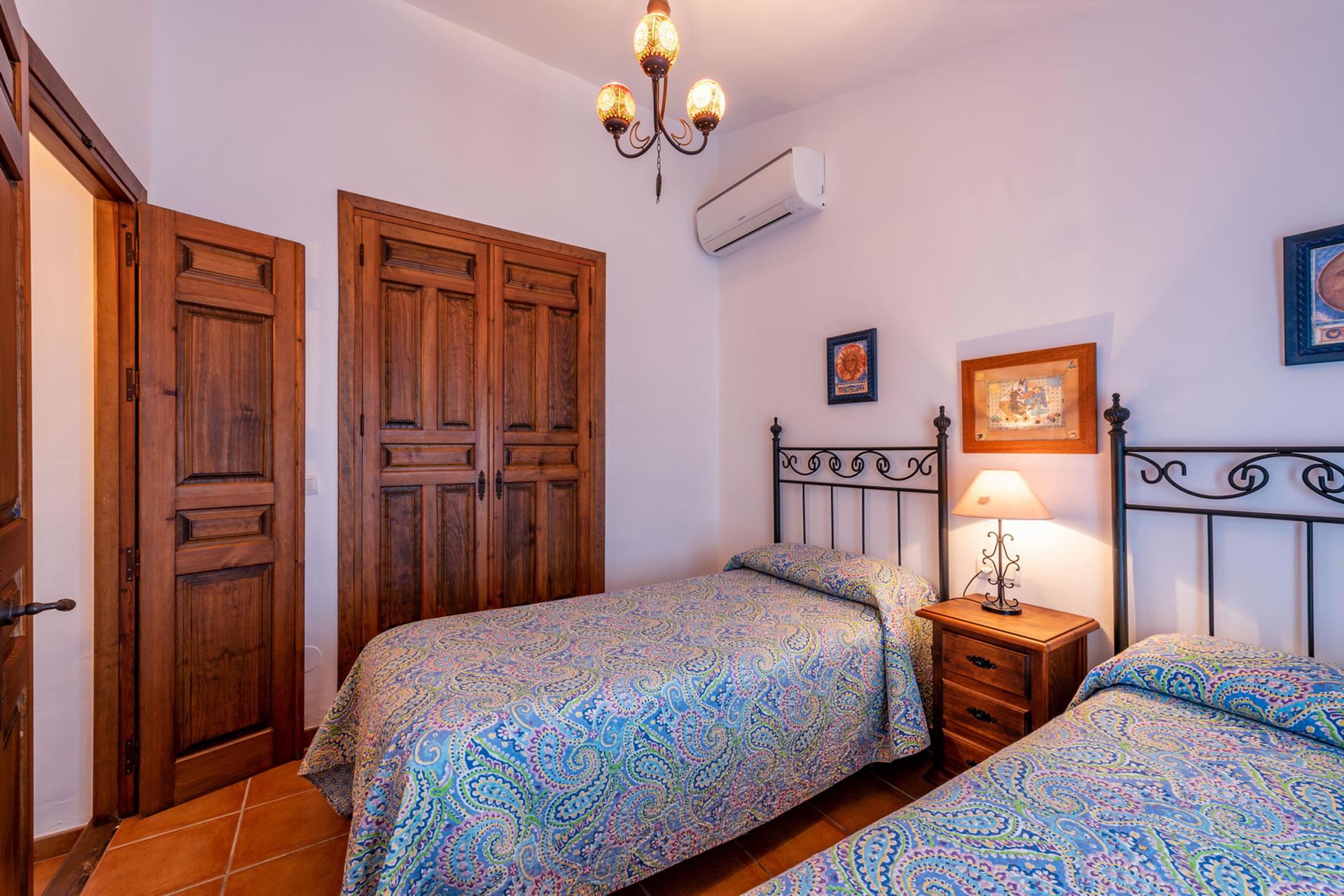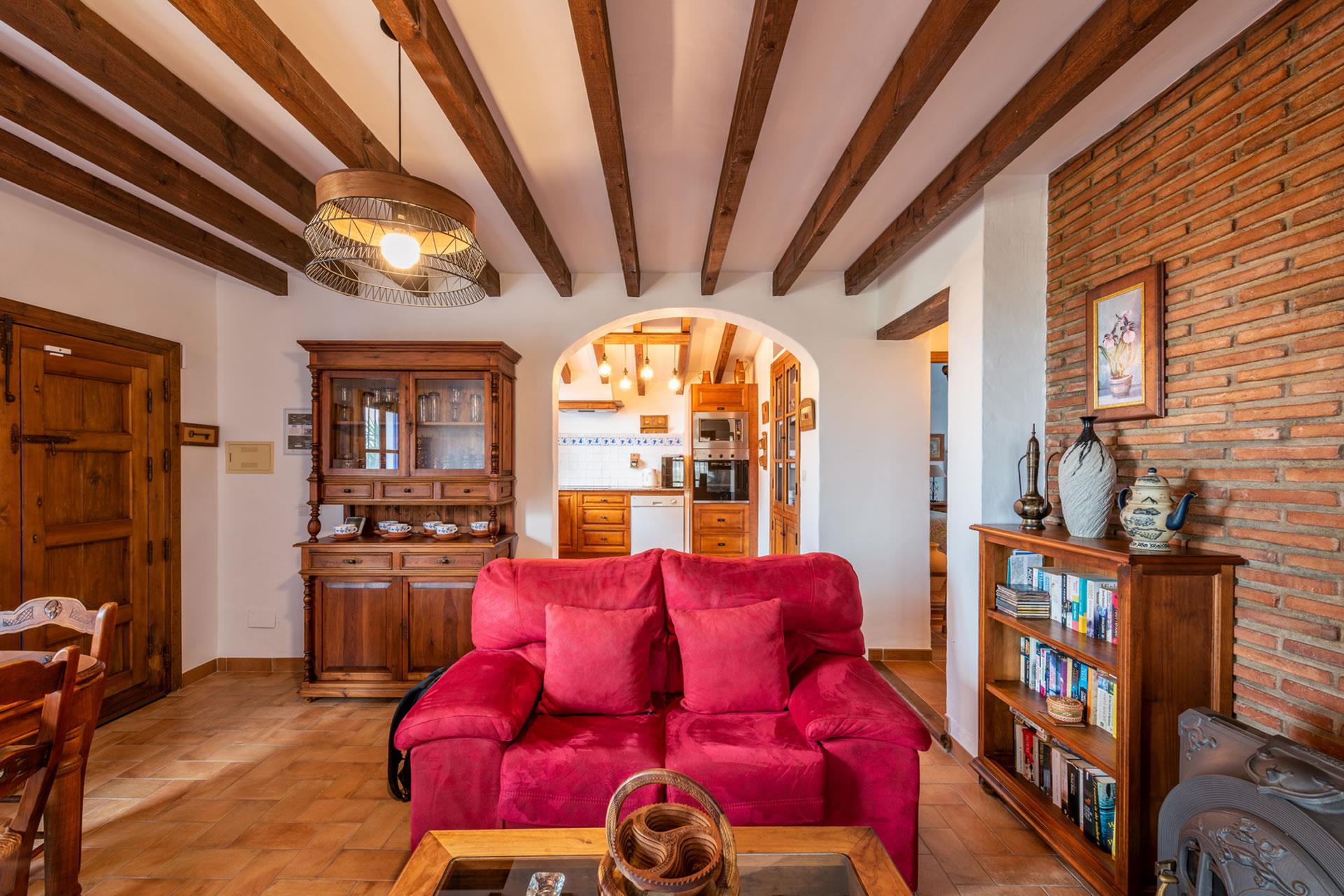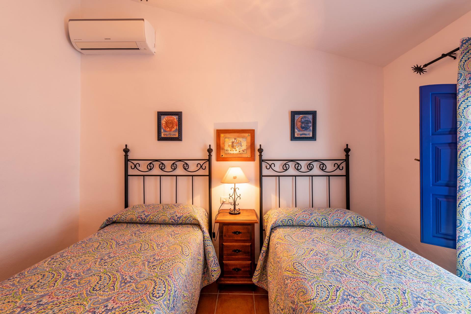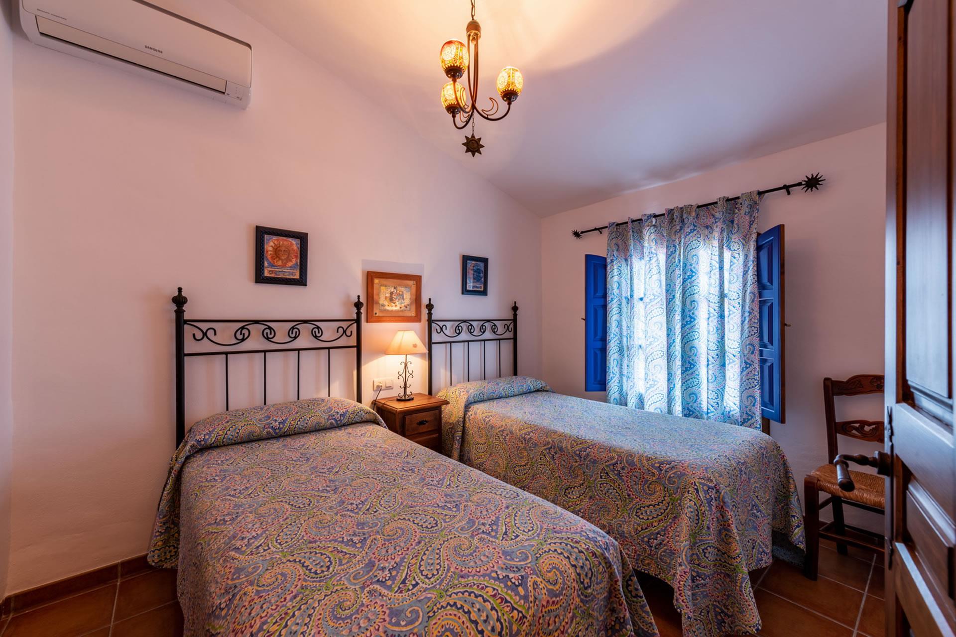 Toutes les pièces du gîte sont au rez-de-chaussée, aménagées avec goût et décorées dans un style rustique andalou. L'intérieur présente un espace décloisonné avec une marche qui monte à une grande cuisine; l'espace du salon comprend un téléviseur, un appareil de musique et un poêle à bois pour réchauffer les hivers. Le plafond est élevé, ouvrant l'espace et augmentant le confort de l'aération durant les jours d'été. Les fenêtres sont grandes et les portes-fenêtres avec moustiquaires ouvrent sur la véranda ombragée. La cuisine est bien équipée avec plaque de cuisson vitrocéramique à 4 feux, four, micro-ondes, lave-vaisselle, réfrigérateur / congélateur, vinothèque et cafetière. Un lave-linge est installé dans une pièce à part. Il y a 2 chambres (une à 1 lit 2 personnes, une à 2 lits 1 personne) et une salle de douche avec WC et lavabo.