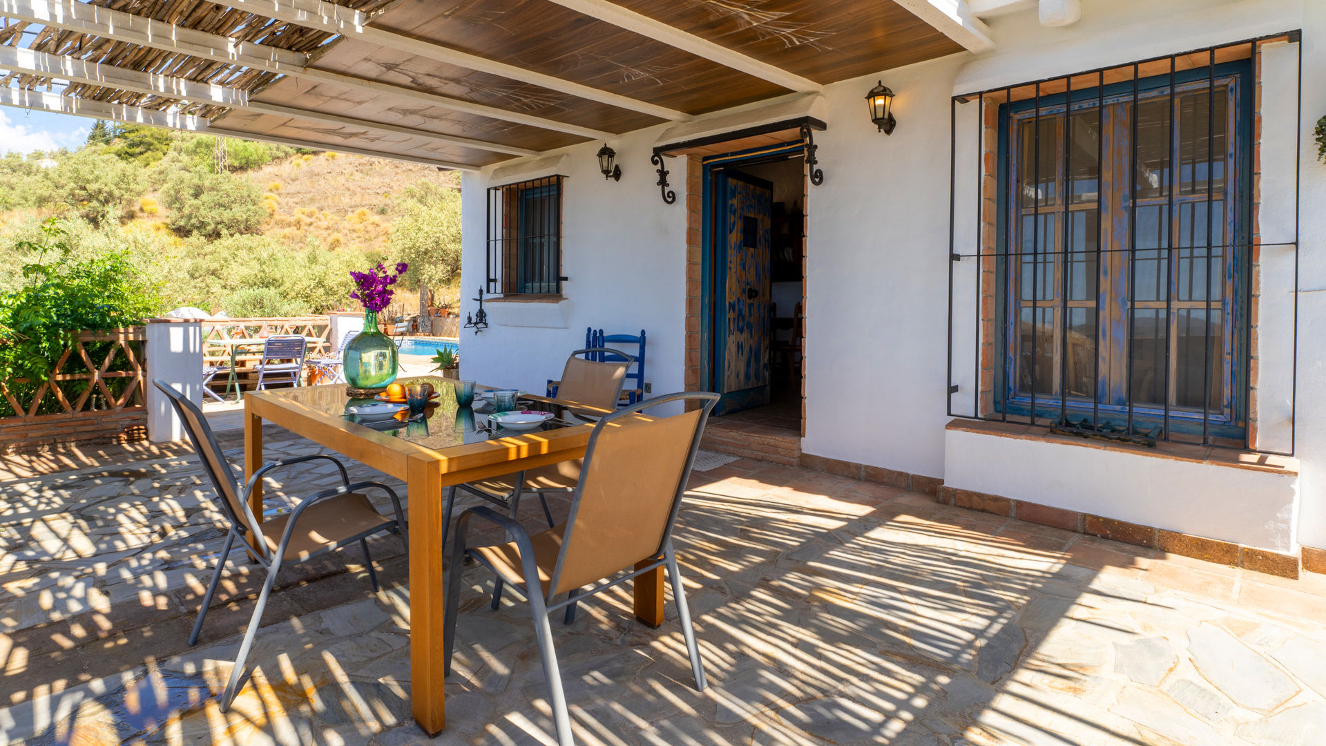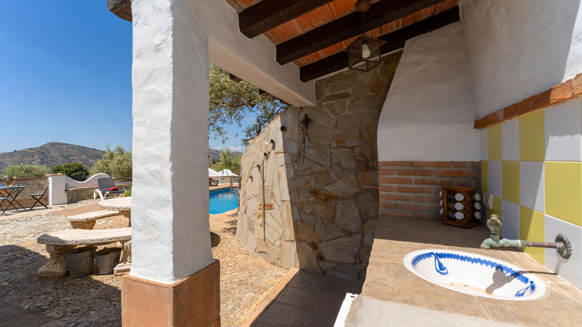 On ne pourrait pas être plus andalou. Le plafond avec poutres apparentes, le carrelage en terre cuite et les murs blancs/ocre mettent en évidence les racines de l'Espagne méridionale de ce charmant cottage traditionnel. Il est niché sur une colline d'oliviers et d'avocatiers avec vue sur la campagne et sur la Méditerranée. Paisible et charmant... Parfait pour un séjour relaxant et romantique au soleil !