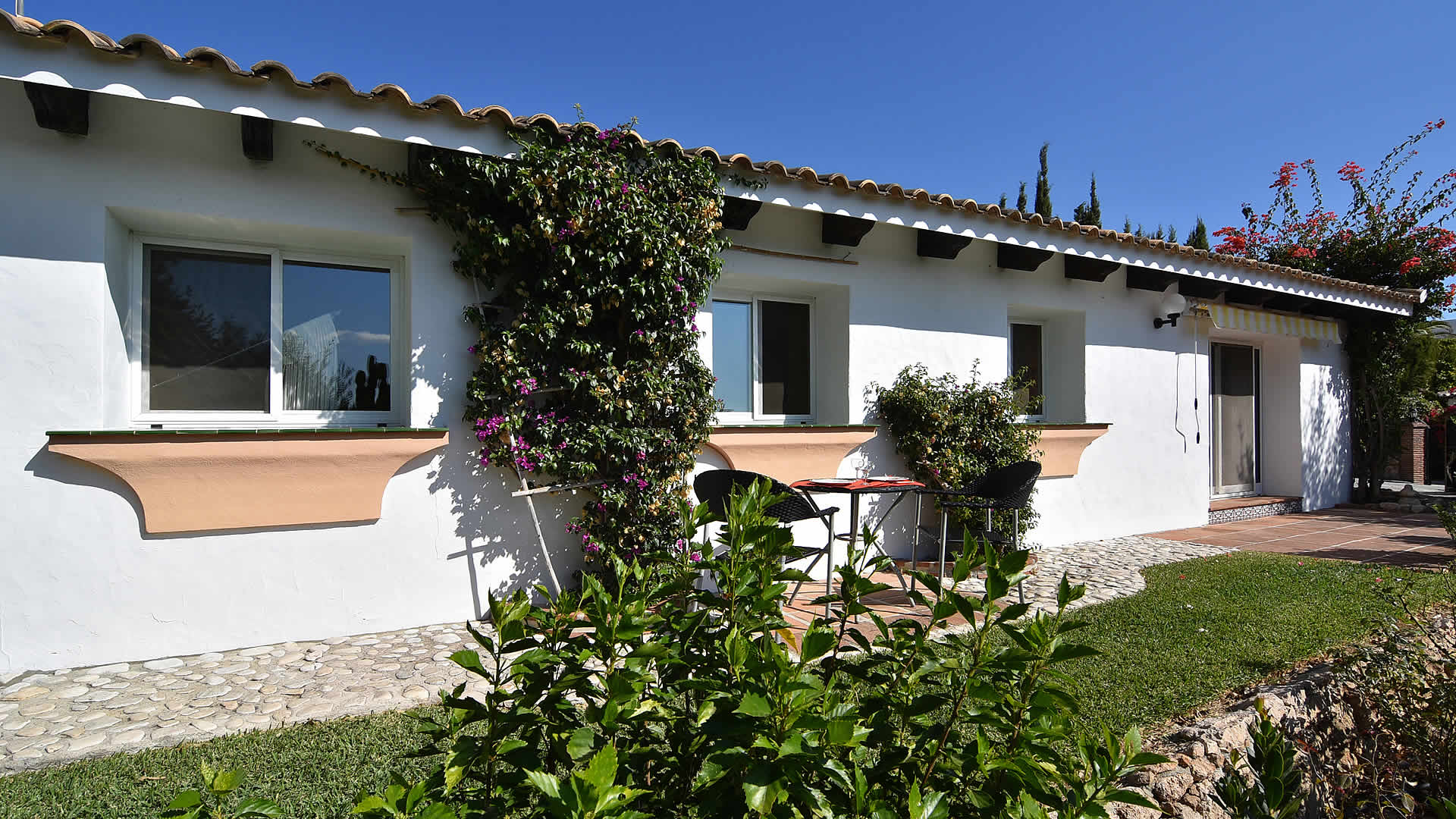 L’implication des propriétaires pour les zones extérieures de cette villa se reflète également dans son intérieur. Avec toutes les pièces sur un étage, c'est une maison très confortable avec beaucoup de charme. L'ameublement et la décoration sont d'excellente qualité et ont été choisis avec une attention aux détails, évoquant un sentiment d'accueil. De la terrasse avant, la porte d'entrée s'ouvre sur le salon, équipé d'un canapé et un fauteuil, une télévision à écran plat avec réception satellite, DVD et radio / lecteur CD (à noter qu'une nouvelle télévision à écran plat de 32 pouces vient d’être installée, légèrement plus petit que celle montrée sur les photos). Le salon donne accès à une salle à manger confortable, avec une table pour 6 personnes, et à la cuisine ouverte adjacente. La cuisine est décorée avec du bois et des carreaux andalous et est bien équipée avec 4 feux gaz, réfrigérateur / congélateur, four électrique, micro-ondes, lave-linge et lave-vaisselle. Il y a 2 chambres doubles (avec deux lits respectivement) avec un placard dans chacune d’elles et une chambre double principale (avec lit double) qui fait usage de l'armoire située dans le couloir adjacent. Il y a de 2 salles de bain complètes, toutes deux équipées de baignoire, lavabo et WC.
