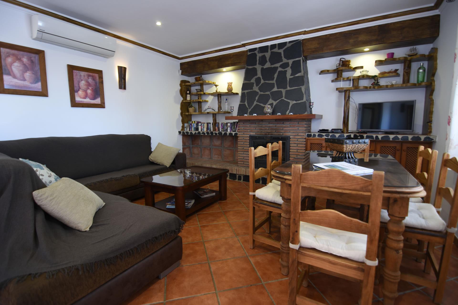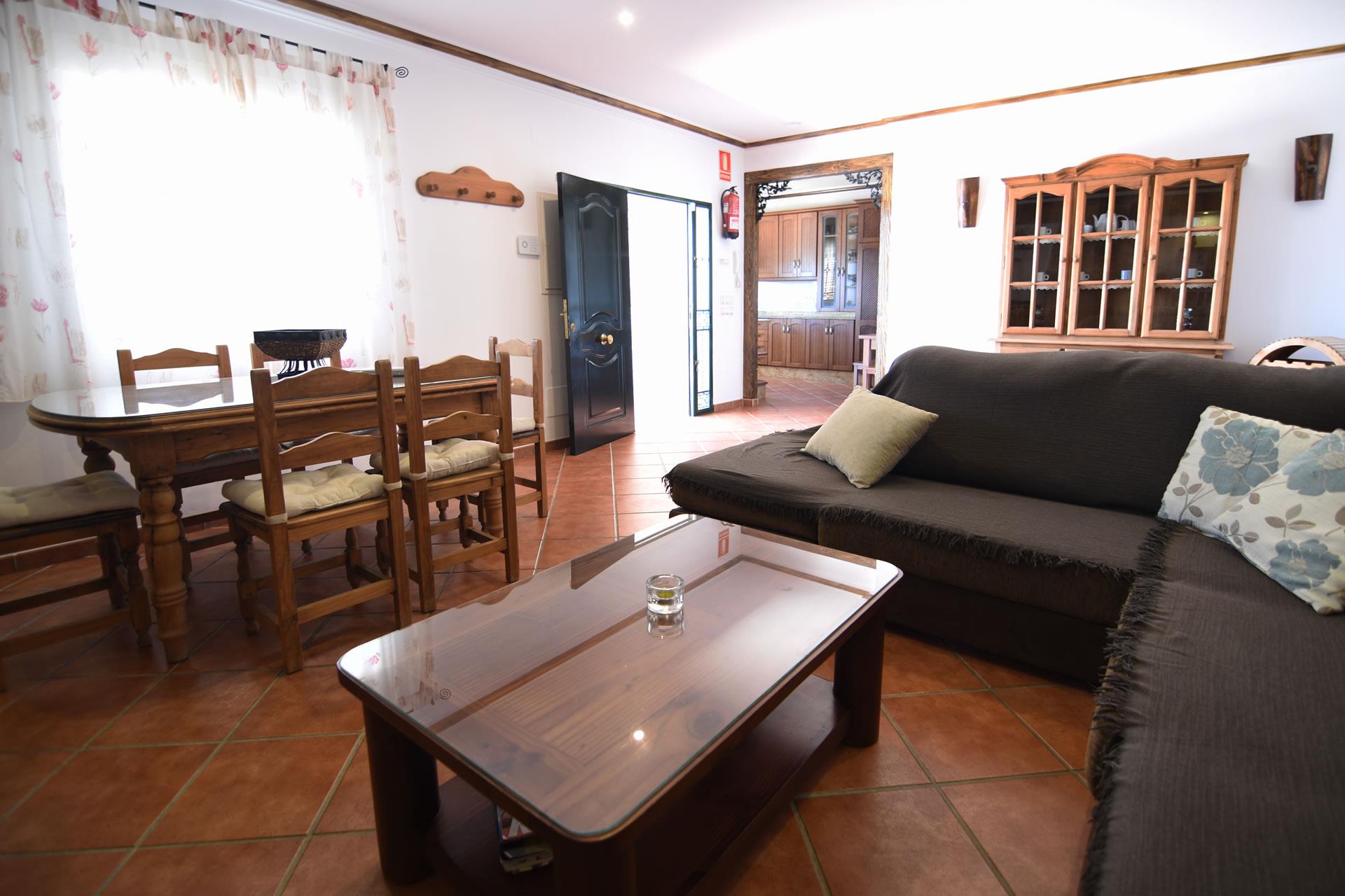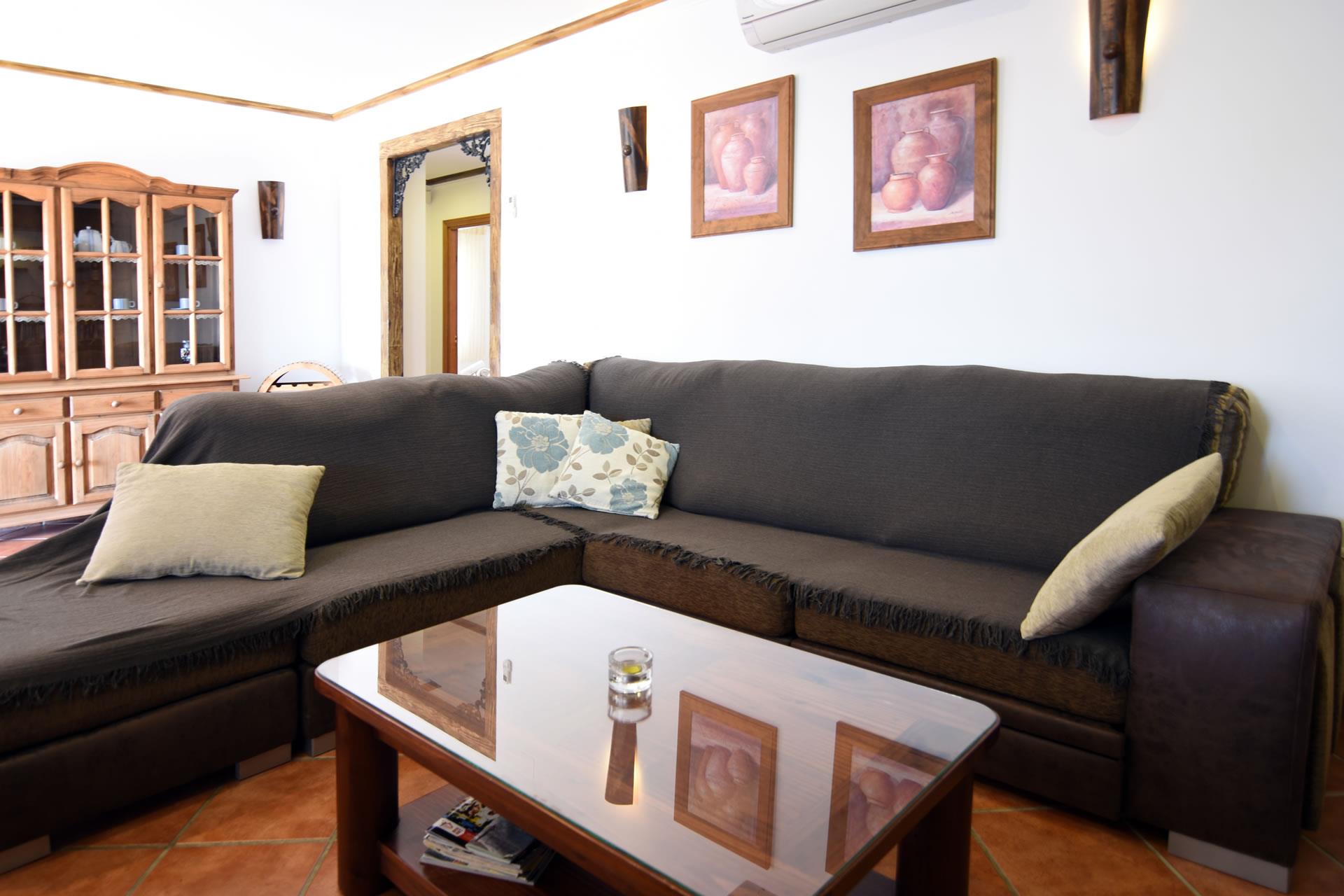 Un très confortable salon/salle à manger est décoré dans un style rustique avec un foyer ouvert, une table pour 6, 2 divans et la télévision par satellite. La cuisine a été récemment rénovée et est très bien équipée : plaque de cuisson vitrocéramique, four électrique, micro-ondes, réfrigérateur / congélateur, lave-vaisselle et lave-linge. Les chambres accommodent 6 personnes : une à 1 lit 2 personnes et deux à 2 lits 1 personne; elles partagent deux salles de bain complètes avec WC, douche dans la baignoire, bidet et lavabo. Une des salles de bain a un jacuzzi. Il y a un coffre de sécurité. Toutes les chambres sont climatisées. Internet WiFi est offert (gratuit).