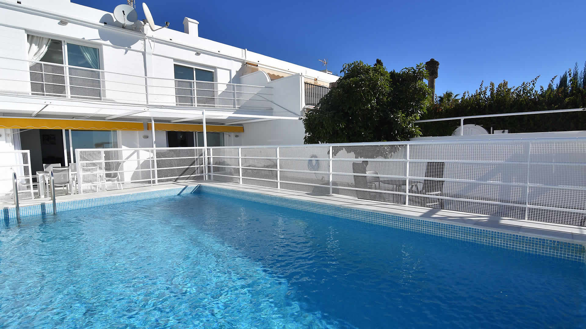 Imaginez : vous traversez le seuil, tournez à gauche, marchez 80 m et… vous vous allongez sur la plage! Si vous préférez, vous pouvez vous reposer sur la terrasse avec une rafraîchissante sangria. C'est possible : cette magnifique villa est située sur la rue Carabeo, au coeur de Nerja. Vous bénéficierez de votre piscine privée sur une terrasse ensoleillée tout en profitant de la vue spectaculaire de la plage et de la Méditerranée. Au cas où vous préféreriez visiter les attraits majeurs de l'Andalousie sans conduire, vous pouvez réserver une excursion guidée ou utiliser le transport en commun; l'arrêt d'autobus est à 800 m. Cette villa présente une spacieuse terrasse avec une piscine privée (7m x 3.7m) fournie de chaises longues. Un grand écran pare-soleil recouvre le coin-repas, lieu idéal pour profiter d'un lunch à l'ombre; le barbecue à gaz et les meubles de patio sont fournis.