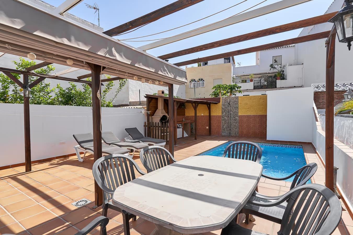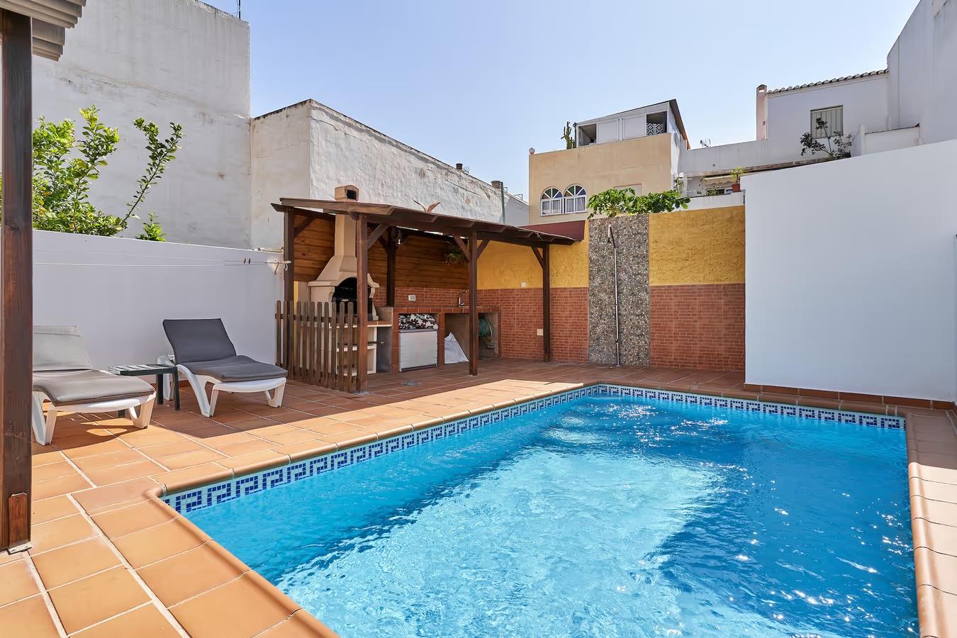 Belle villa confortable avec piscine privée à Nerja, Costa del Sol, Espagne pour 6 personnes. La maison de vacances est située dans une région balnéaire et urbaine, près de restaurants et bars, de magasins et de supermarchés, à 1 km de la plage de Calahonda et à 1 km de Mediterráneo.
